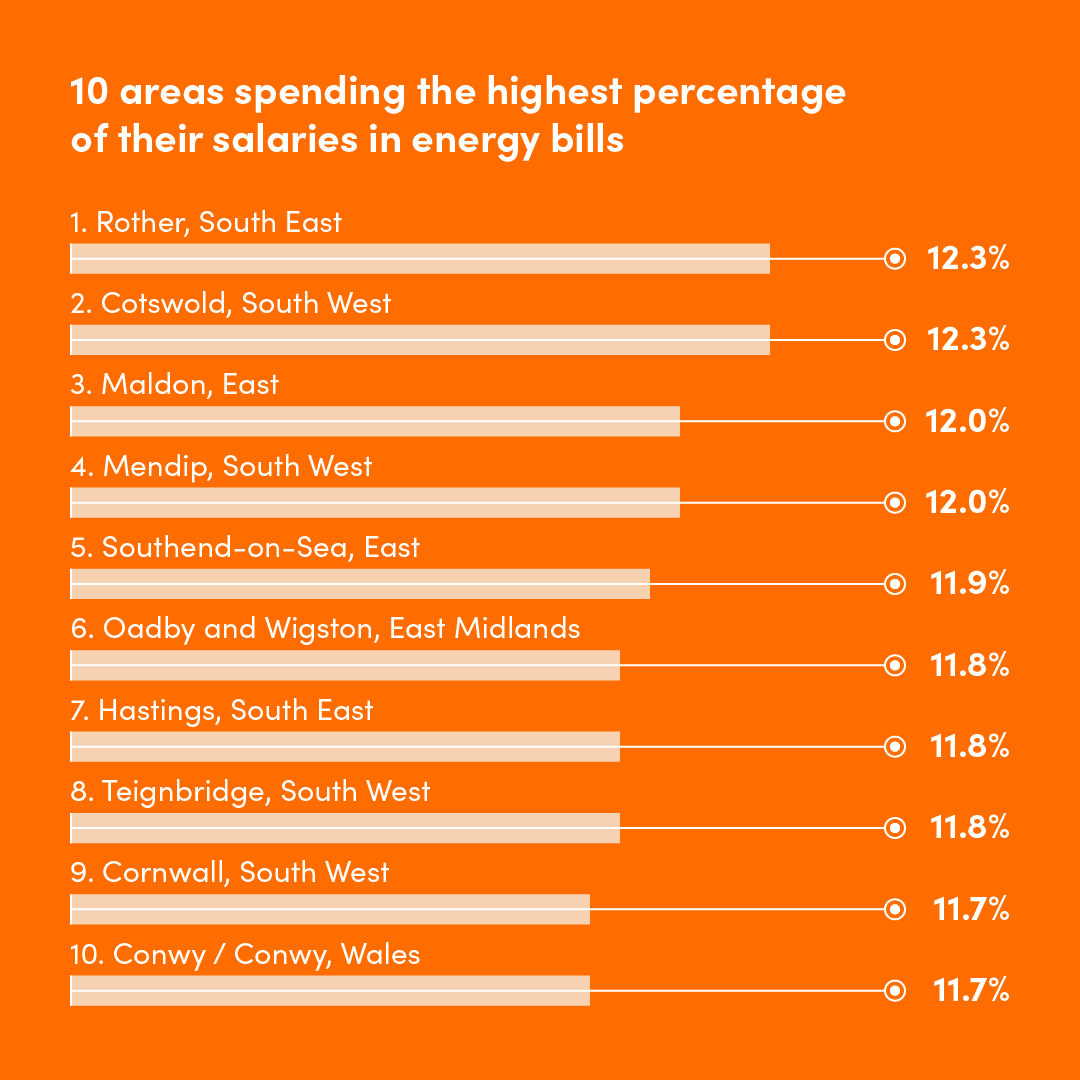 While this still always depends on energy usage and method of payments, our research has shown that with an average take home salary of £16,523 per year, and an average energy bill of £2,039 in the region, residents in the rural Rother district in the South East currently spend the highest percentage of their salary on energy bills. This is followed by those in the Cotswold district (South West) (£16,754 average salary vs £2,062 energy bills, which also equates to 12.3%).