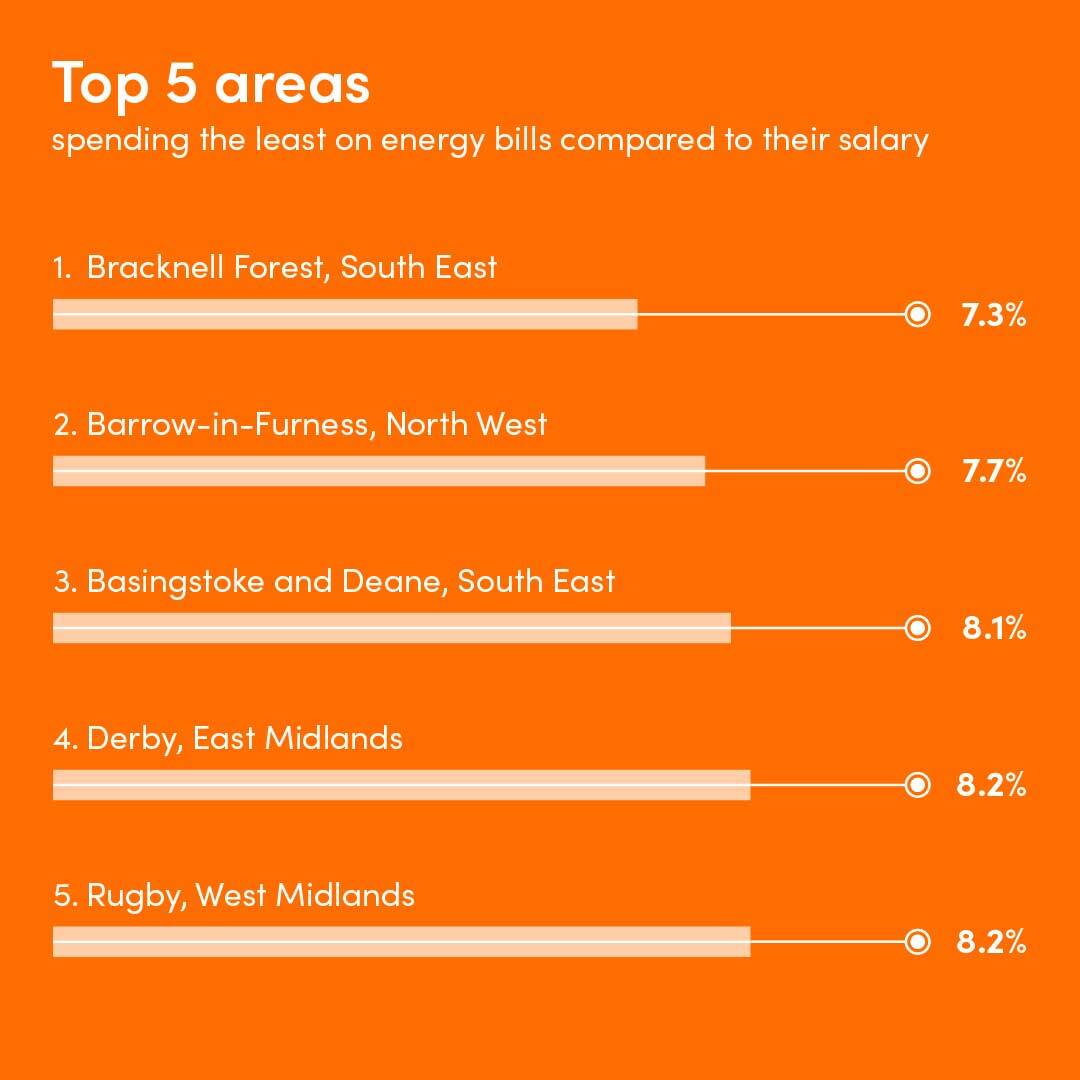Top five areas spending the least on energy bills compared to their salary (outside of London)