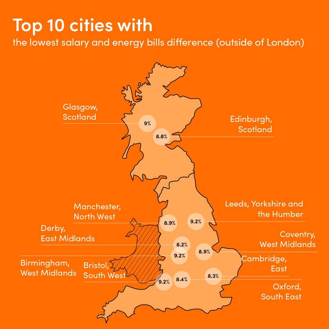 10 cities with the lowest salary and energy bills difference (outside of London)