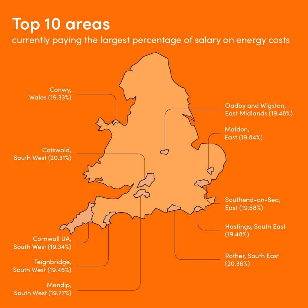For the ten areas of the country currently paying the largest percentage of salary on energy costs, an October price rise of 80% would leave some areas spending over a fifth of their take-home pay on gas and electricity: